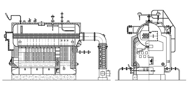 DZH生物質(zhì)臥式蒸汽鍋爐,是一種臥式三回程水火管混合式鍋爐,在鍋筒內(nèi)布置螺紋煙管。爐膛左右二側(cè)裝有光管水冷墻。采用輕型活動爐排、人工加料,配有鼓風機、引風機進行機械通風。該爐前后拱采用新型的節(jié)能技術(shù)爐拱。燃料撒落到爐排上,進入爐膛燃燒后,火焰經(jīng)過后拱折射向上通過本體兩側(cè)燃燼室折向轉(zhuǎn)到前煙箱,再由前煙箱折回鍋內(nèi)管束,通過后煙箱進入省煤器,然后由引風機抽引通過煙道至煙囪排向大氣。
